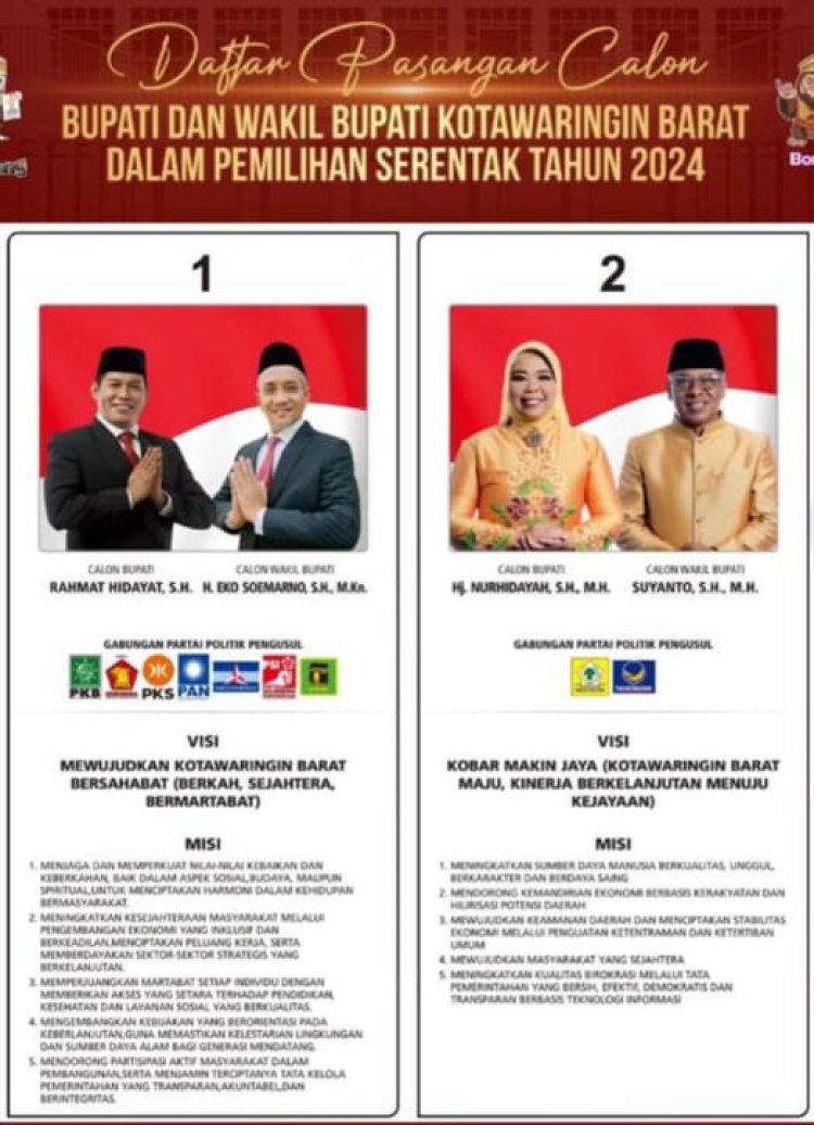 Dalam beberapa bulan terakhir, hiruk-pikuk Pilkada di Kotawaringin Barat semakin terasa dengan adanya berbagai kampanye, debat publik, dan acara-acara sosial yang melibatkan pasangan calon. Dua kandidat yang bersaing pada Pilkada Kobar Tahun 2024 ini yaitu Rahmat Hidayat, S.H dan Eko Soemarno,S.H., M. Kn serta Nurhidayah, S.H.,M.H dan Suyanto, S.H.,M.H telah berusaha meyakinkan masyarakat dengan program-program unggulan yang menjawab permasalahan di daerah, seperti infrastruktur, pendidikan, kesehatan, dan pemberdayaan ekonomi masyarakat.